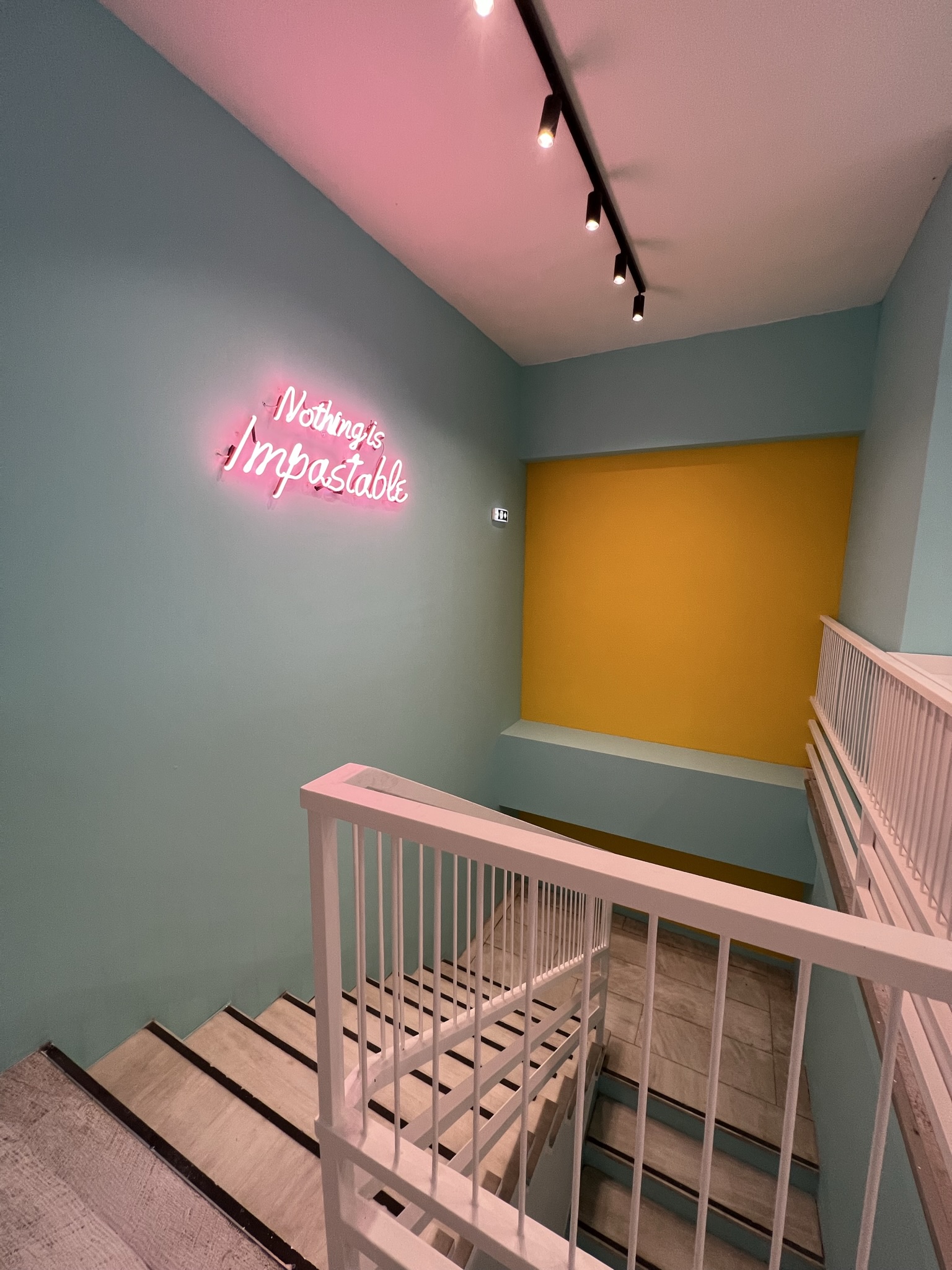 Inside the restaurant, the bar counter wraps around the cooking equipment creating a bright open kitchen. The use of white tiles that line the bar and kitchen contributes to the creation of a welcoming and luminous interior space. The seating and work areas are highlighted by the use of bright yellow tiles and together with the pink details make a bold statement adding to the place’s identity.