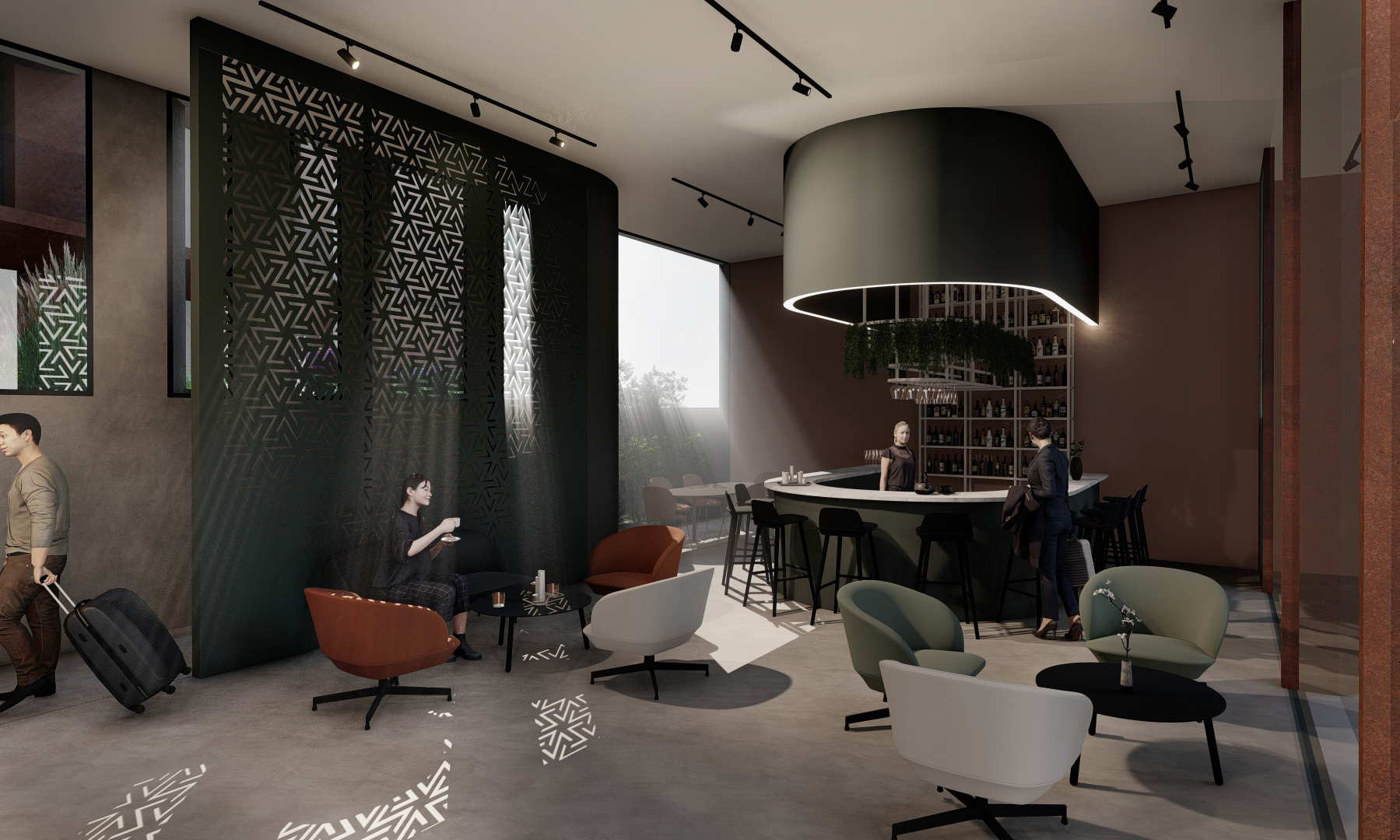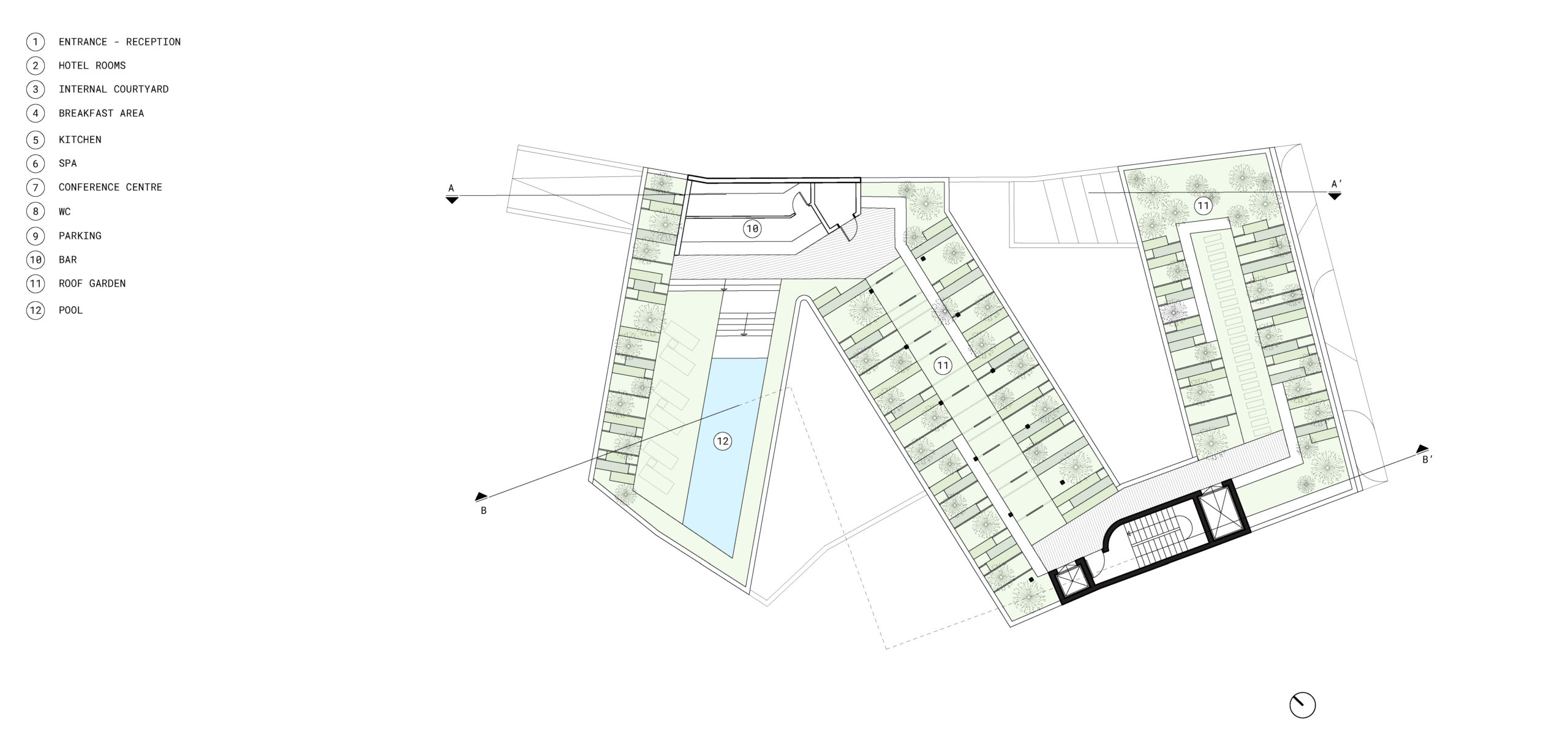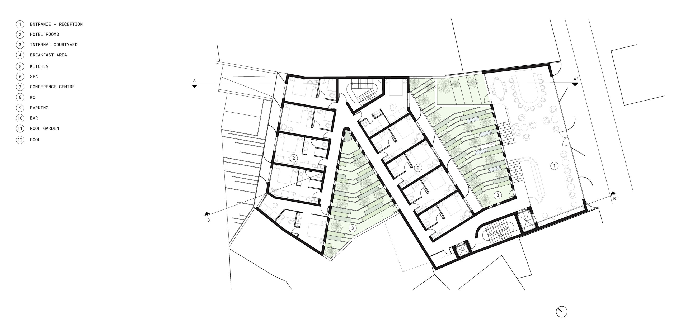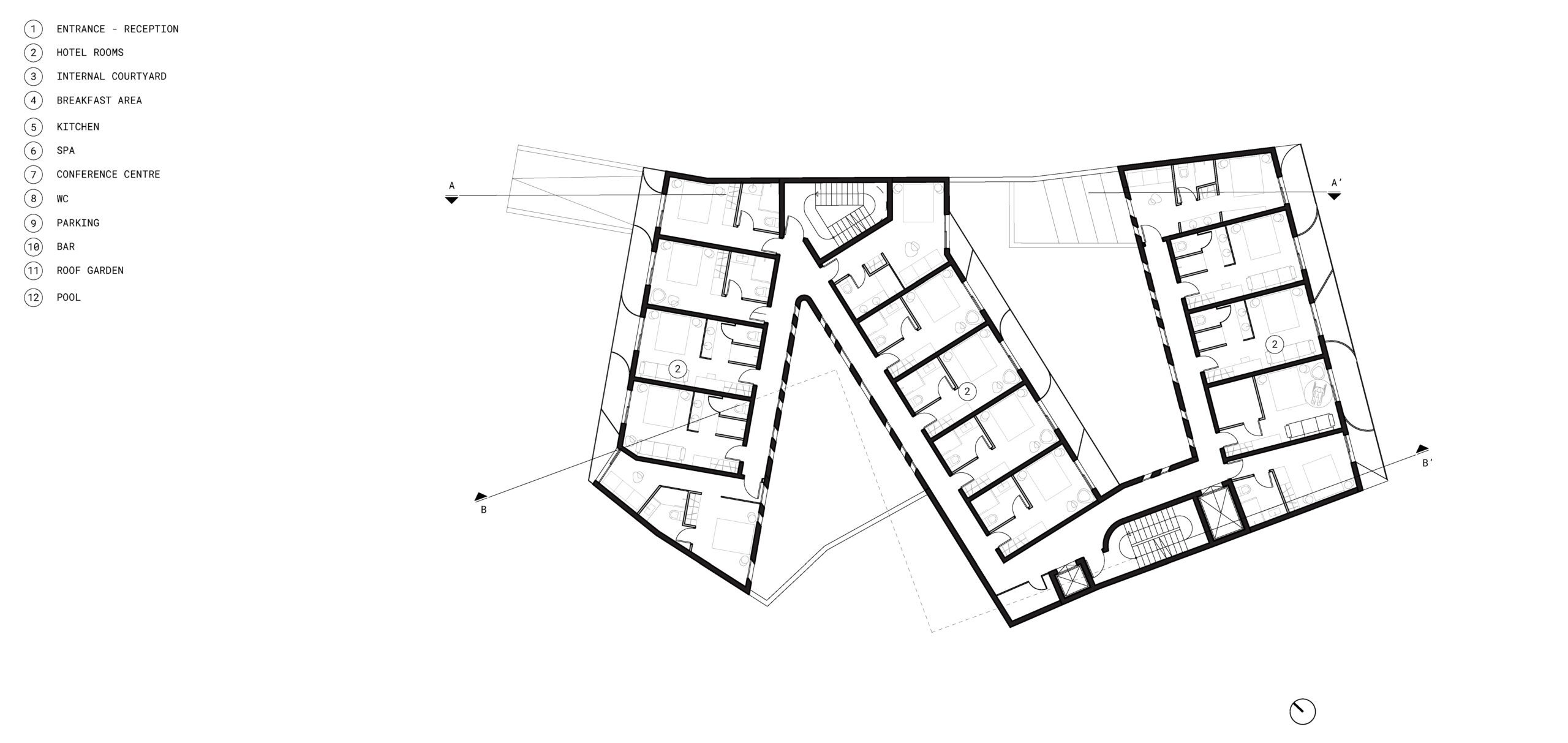 Based on this and on the complex geometrical shape of the site the hotel plan is developed in 3 wings forming a Z shape in plan. This organization of the plan allows the formation of 3 courtyards (2 internal and one external) that have a critical role in achieving natural light and ventilation for all the hotel rooms while maximizing the privacy for the users.
