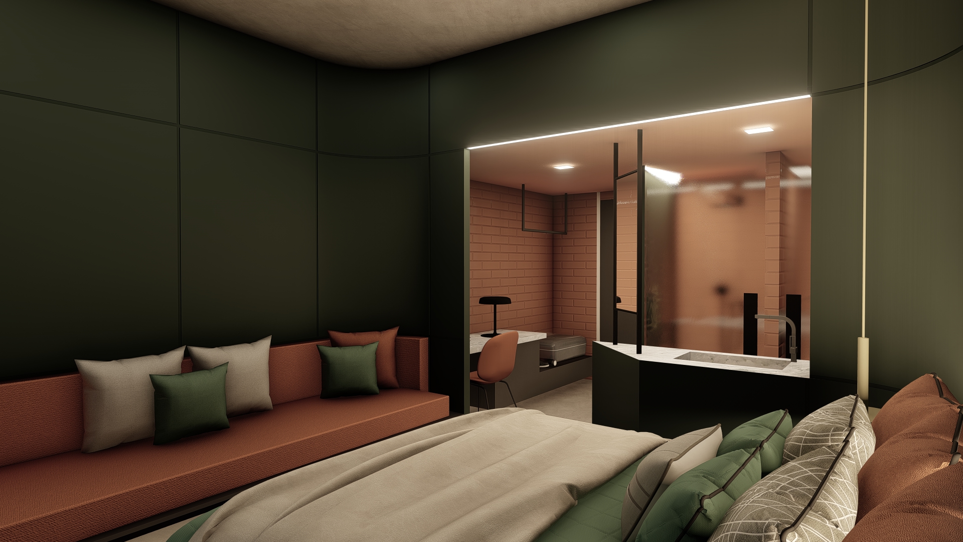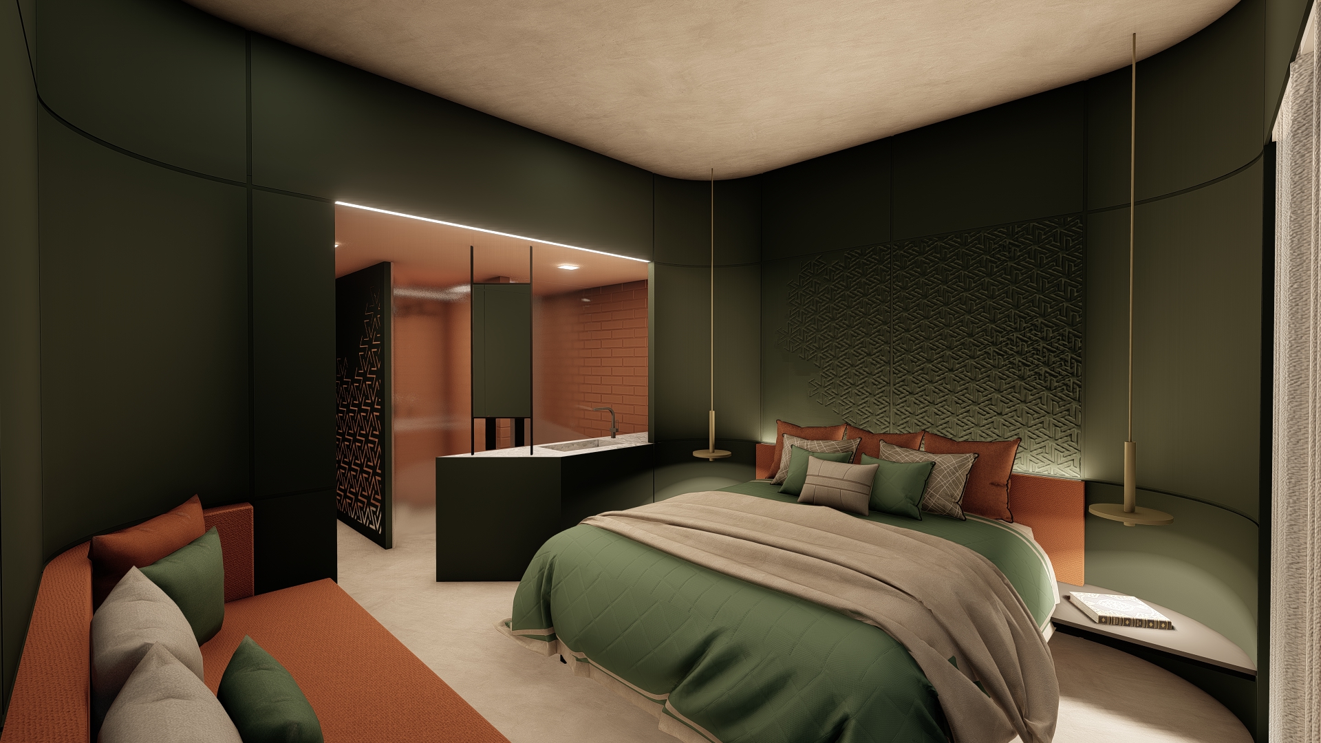 The balcony dividers between the rooms are of 3 geometrical typologies – flat, concave and convex. The variation of the divider’s geometry between floors combined with the inclined ceilings of the balconies creates and alternating rhythm pattern on the facades of the building.